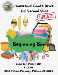 Drop off your contributions of Household Goods for Second Shift at: 3552 Pelham Parkway, Pelham, AL 35124, from 1:00 pm – 3:00 pm.